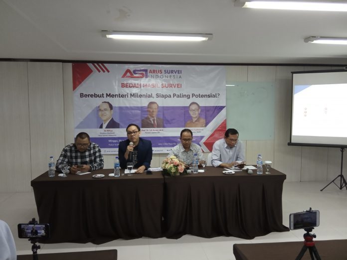 Lembaga Arus Survei Indonesia (ASI) menggelar bedah hasil survei pakar/public opinion makers (POM) bertema ”Berebut Menteri Milenial, Siapa Paling Potensial?”. Kriteria penarikan 20 figur menial melaiui tiga tingkatan, yakni masuk dalam radar survei pakar/public opinion makers Arus SurveiIndonesia yang dilaksanakan pada 26 Februari 12 Maret 2019, analisis media (April-Juli 2019) dan analisis peluang (ada restu partai politik/ormas/kedekatan khusus dengan Jokowi).