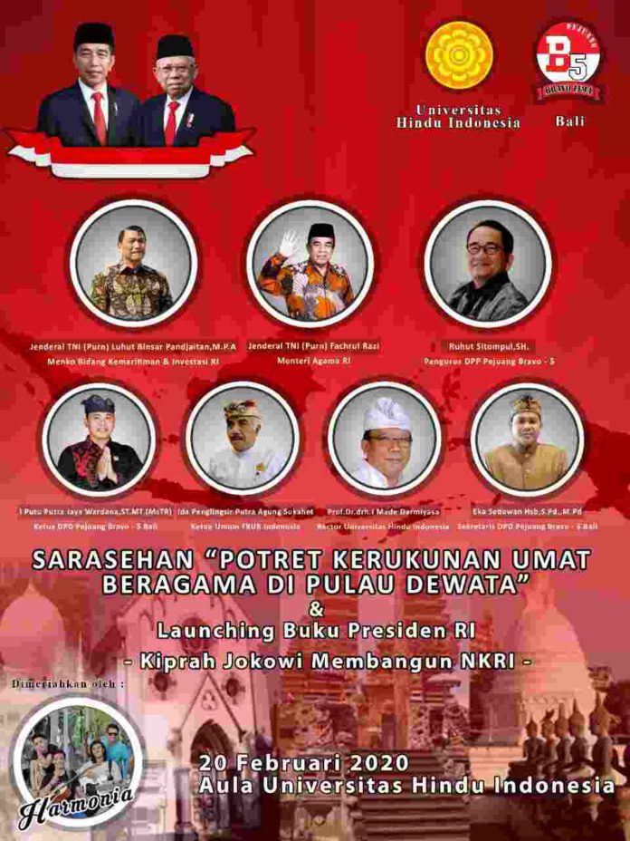 Melihat tingkat toleransi yang luar biasa antar umat beragama, Ketua PBL Bali I Putu Putra Jaya Wardana.ST.MT(MsTR) bersama seluruh komponen Pejuang Bravo 5 Bali akan menyelenggarakan Sarasehan bertajuk “Potret Kerukunan Umat Beragama di Pulau Dewata Bali” dan sekaligus pada puncak acara ini akan diadakan Launching buku Bapak Presiden RI. Buku dengan judul “Kiprah Jokowi Membangun NKRI”. Ujar Ketua PBL Bali Kepada awak media, selasa 18/02/20 malam.