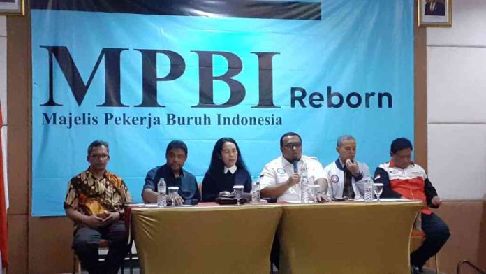 Majelis Pekerja/Buruh Indonesia (MPBI) menggelar konferensi pers untuk menyatakan sikap perihal Omnibus Law RUU Cipta Kerja di Hotel Puri Denpasar, Kuningan, Jakarta (28/2/20).