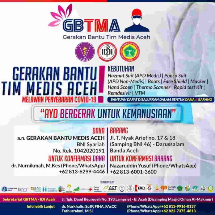 Oleh karena itu, Gerakan Bantu Tenaga Medis Aceh (GBTMA) menghimpun bantuan untuk tenaga medis Aceh agar dapat melaksanakan tugas secara optimal sesuai dengan kaidah medis yang telah ditentukan. Kami mengajak masyarakat, para dermawan untuk sudi kiranya ikut terjun turun tangan guna membantu memenuhi kelengkapan alat medis kepada para tenaga medis dan menyadarkan dan memamtukan masyarakat dalam penannggulangan Covid 19 di Provinsi Aceh.