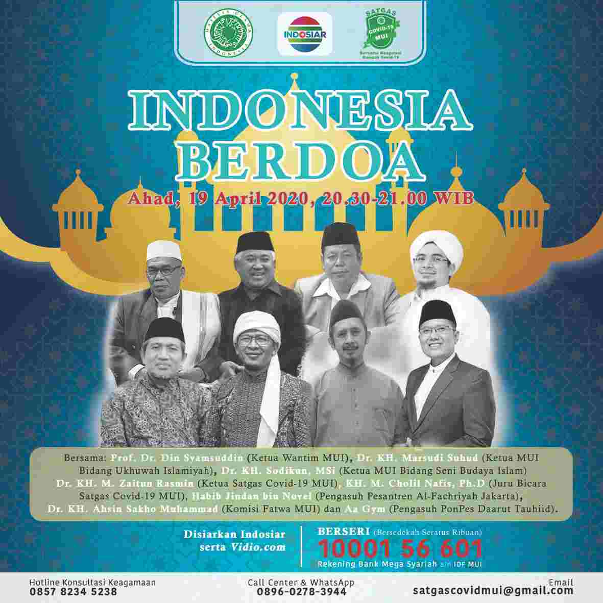 Dia menjelaskan, Indonesia Berdoa jilid pertama akan diramaikan dengan sejumlah tokoh ulama nasional di antaranya Prof Din Syamsuddin (Ketua Dewan Pertimbangan MUI), Dr KH Marsudi Suhud (Ketua MUI Bidang Ukhuwah Islamiyah), KH Dr Sodikun (Ketua MUI Bidang Seni Budaya Islam), KH M Zaitun Rasmin (Ketua Satgas Covid-19 MUI), KH M Cholil Nafis (Juru Bicara Satgas Covid-19 MUI, Habib Novel bin Jindan (Pengasuh Pesantren Al-Fachriyah, Jakarta), KH Ahsin Sakho Muhammad (Komisi Fatwa MUI), dan Pimpinan Daarut Tauhid, KH Abdullah Gymnastiar (Aa Gym)
