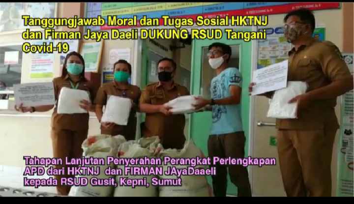 Sumbangan partisipasi yang disampaikan sebagai tugas dan tanggungjawab bersama ini masih amat kecil, sedikit, dan terbatas jumlahnya. Kita sama-sama berpengharapan semoga sumbangan partisipasi ini dapat bermanfaat bagi kalangan dokter, tenaga medis, dan pelayan terkait lainnya yang membutuhkan APD. Komunitas HKTNJ dan Firman Jaya Daeli memohon maaf kepada jajaran RSUD Gusit, Kepni, Sumut karena perangkat perlengkapan APD yang sudah diserahkan, tergolong masih dalam jumlah kecil, sedikit, dan terbatas. Komunitas HKTNJ dan Firman Jaya Daeli, untuk sementara ini tidak ke lokasi setempat di Kepni karena juga tengah melaksanakan program dan kegiatan pembagian bahan makanan (“sembako”) dan APD di kawasan Jabodetabek dan wilayah lain di Indonesia