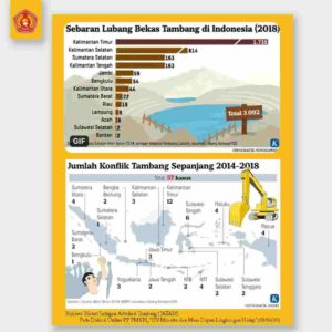 Sementara untuk konflik, sejak tahun 2014 hingga tahun 2019, ada 57 konflik yang muncul karena operasi pertambangan. Diantaranya, Sumatera Utara sebanyak 4 kasus, Bangka Belitung 2 konflik, Kalimantan Selatan 3 Konflik, Kalimantan Timur 12 kasus, Sulawesi Tengah 6 kasus, Sumatera Barat 2 kasus, Bengkulu 1 kasus, Sumatera Selatan 1 kasus, Jawa Timur 3 kasus, Yogyakarta 3 kasus, Jawa Tengah 2 kasus, NTB 2 kasus, NTT 4 kasus, Sulawesi Selatan 2 kasus, Sulawesi Tenggara 2 kasus, Papua 4 kasus, dan Maluku 4 kasus.
