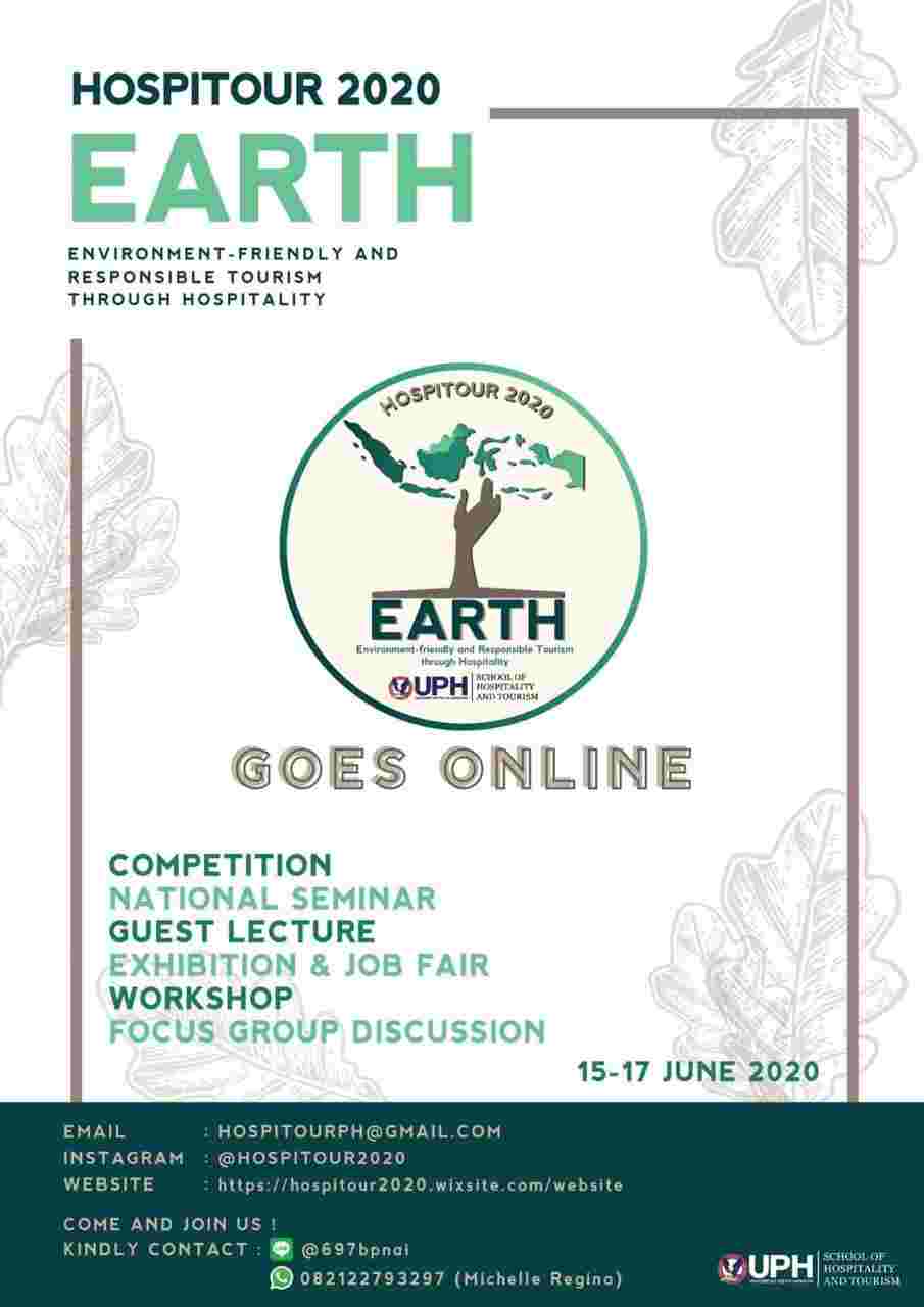 HOSPITOUR merupakan acara tahunan dari Fakultas Pariwisata yang turut beradaptasi dengan keadaan new normal ini dengan menghadirkan rangkaian acara online yang menarik. EARTH, Environment – Friendly and Responsible Tourism Through Hospitality – menjadi tema utama yang dipilih Hospitour 2020 yang berlangsung pada 15-17 Juni 2020.