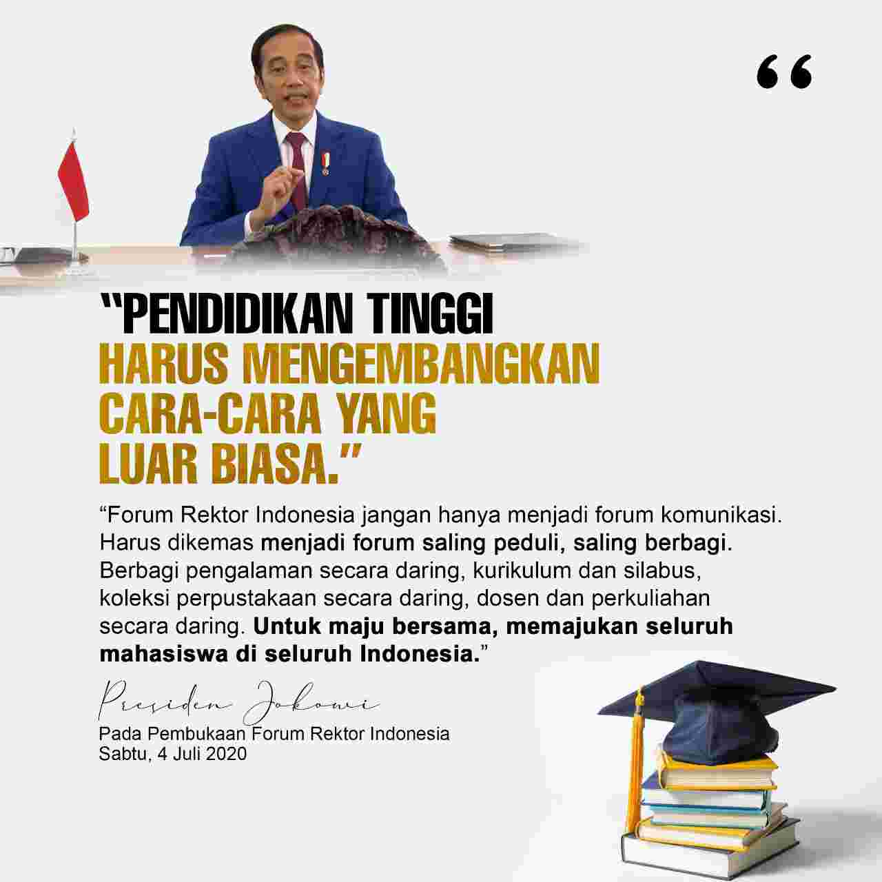Saat meresmikan pembukaan Konferensi Forum Rektor Indonesia (FRI) secara virtual dari Istana Kepresidenan Bogor, Jawa Barat, pada Sabtu, 4 Juli 2020, Presiden Joko Widodo menyampaikan sejumlah pesannya bagi FRI untuk dapat mengembangkan strategi baru yang dapat menjadikan perguruan tinggi mampu mencetak generasi unggul untuk membangun Indonesia maju.