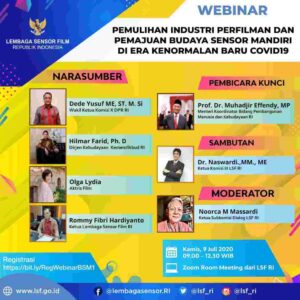 Kamis (9/7) Lembaga Sensor Film menyelenggarakan Budaya Sensor Mandiri pertama kalinya secara daring dengan mengangkat tema “Pemulihan Industri Perfilman dan Pemajuan Budaya Sensor Mandiri di Era Kenormalan Baru Covid19.” Sosialisasi secara daring ini diikuti oleh lebih kurang 380 peserta yang teregistrasi melalui jalur pendaftaran resmi yang diberikan oleh LSF sebagai penyelenggara.