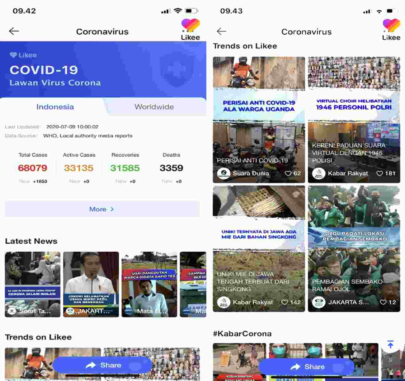 Tidak hanya data terkini, Likee juga menghadirkan hashtag #KabarCorona pada corner ‘Covid-19’. Hashtag #KabarCorona ini berfungsi untuk menggabungkan informasi yang perlu diketahui perihal Covid-19 yang dikemas dalam format video pendek. Hal ini tidak hanya membuat pengguna mendapatkan informasi dengan format yang berbeda, tetapi pengguna juga dapat berkontribusi dalam menyuguhkan informasi sambil meningkatkan kreativitas mereka.