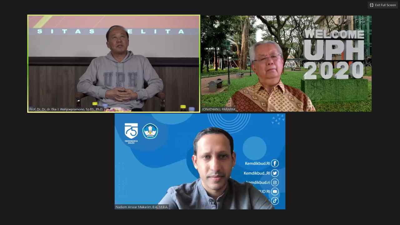 Di hari kedua UPH Festival 2020 ‘Grow and Go’, mahasiswa baru UPH disapa oleh Menteri Pendidikan dan Kebudayaan (Mendikbud) Republik Indonesia Nadiem Anwar Makarim, B.A., M.BA dalam acara Distinguished Guest Speaker (DGS) pada 19 Agustus 2020 melalui aplikasi online. DGS kali ini dipandu Prof. Dr. Dr. dr. Eka J. Wahjoepramono, Sp. Bs., Ph. D. – Dekan Fakultas Kedokteran UPH.