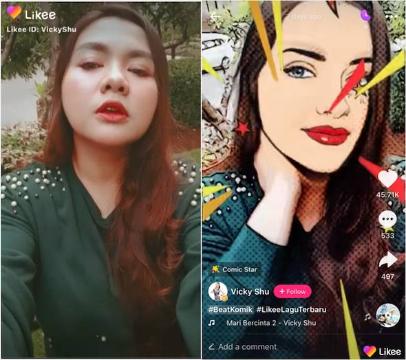 “Menarik banget fitur baru Likee terutama fitur Comic Star, aku tinggal menganggukkan kepala aja, eh tiba-tiba sudah terbentuk karakter komik yang sesuai dengan wajah aku. Efeknya bikin seru saat berkreasi dan lagunya banyak banget juga pilihannya, jadi video atau foto yang aku buat jadi lebih kece,” kata Vicky Shu.