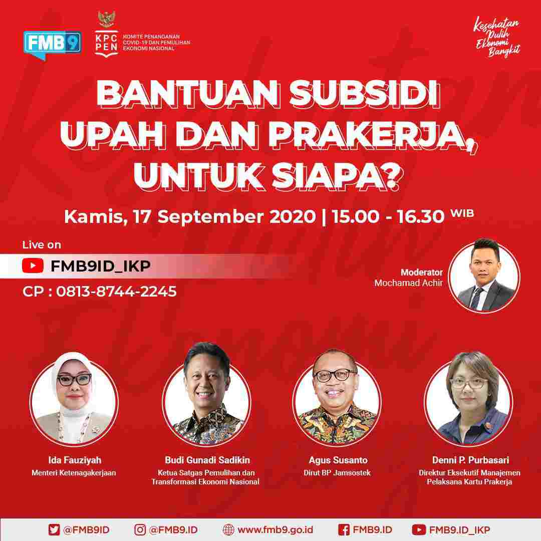 Turut tampil sebagai narasumber Diskusi Media FMB9 Direktur Jenderal Pembinaan dan Pengawasan Ketenagakerjaan dan K3 Kementerian Ketenagakerjaan, Haiyani Rumondang, Ketua Satgas Pemulihan dan Transformasi Ekonomi Nasional Budi Gunadi Sadikin, Dirut BP Jamsostek Agus Susanto serta Direktur Eksekutif Manajemen Pelaksana Kartu Prakerja Denni P Purbasari.