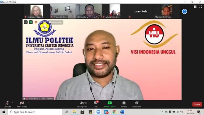 “Kegiatan pendidikan politik bagi warga gereja ini ada dalam kerangka upaya kedua lembaga, Visi Indonesia Unggul dan Prodi Ilmu Politik Fisipol UKI, untuk mewujudkan umat Kristiani yang memahami cara kerja ideal sistem politik dan demokrasi sebagai bentuk sistem pemerintahan maupun sistem politik itu sendiri. Karena sebagai umat Kristiani, melekat pula dalam dirinya sebagai warga negara yang memiliki tugas dan peran mewujudkan demokrasi di Indonesia”, ujar FX. Gian Tue Mali selaku Ketua Program Studi Ilmu Politik Universitas Kristen Indonesia pada kelas pertama pada tanggal 21 September 2020 malam.