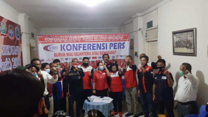 Kantor Konfederasi Serikat Buruh Seluruh Indonesia (KSBSI) melakukan prescon di  Jalan Cipinang Muara Raya Jakarta Timur, Daerah Khusus Ibukota Jakarta pada Rabu (7/10).