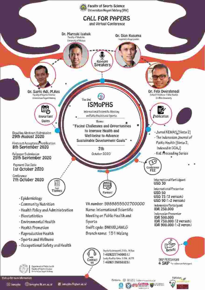 Jurusan Ilmu Kesehatan Masyarakat Fakultas Ilmu Keolahragaan Universitas Negeri Malang (UM) menyelenggarakan konferensi internasional secara virtual berjudul The 2nd International Scientific Meeting on Public Health and Sports (ISMoPHS) 2020. ISMoPHS. Kegiatan ini merupakan kegiatan tahunan dan kali ini mengangkat tema Facing Challenges and Opportunities to Improve Health and Well-being to Advance Sustainable Development Goals (SDGs).
