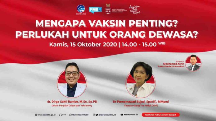 Dr. Purnamawati Sujud, SpA(K), MMped, dari Yayasan Orang Tua Peduli, menyampaikan, “Pencegahan penyakit melalui imunisasi itu paling cost effective, artinya, efisien dan hasilnya baik.” Ini disampaikannya dalam acara Forum Dialog Kabar Kamis bertema “Mengapa Vaksin Penting? Perlukah untuk Orang Dewasa?”, yang diselenggarakan di Media Center KPCPEN, Kamis 15/10/2020.
