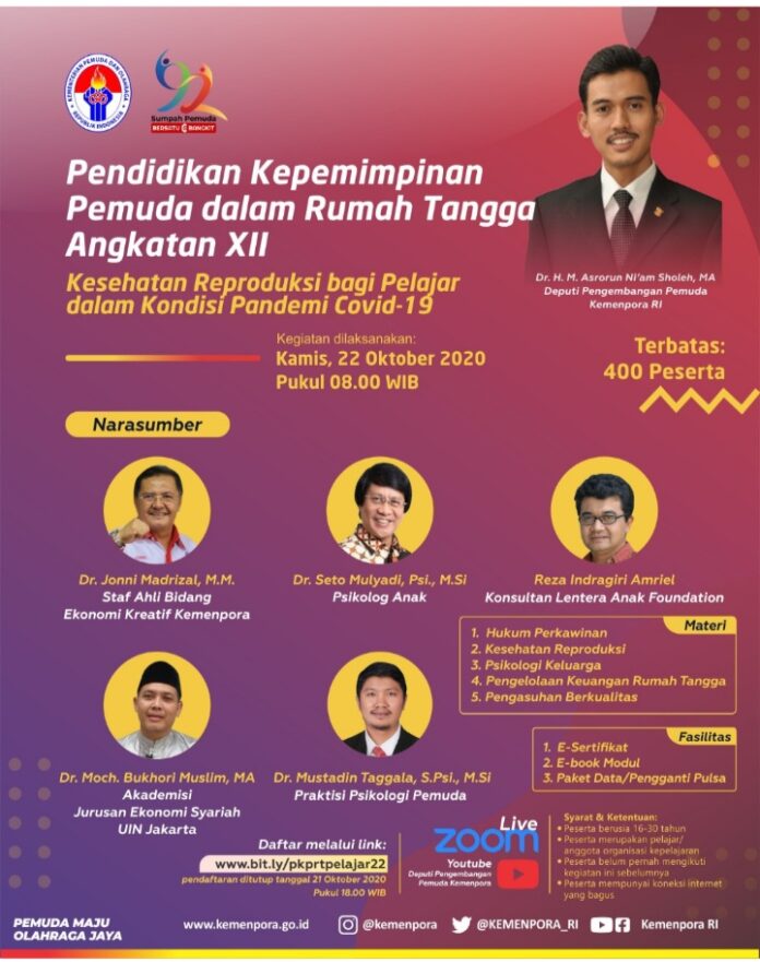 Hal ini dasampaikan oleh Deputi Bidang Pengembangan Pemuda Kemenpora RI Dr. H.M Asrorun Ni’am Sholeh, M.A dalam sambutannya saat pembukaan kegiatan Pendidikan Kepemimpinan Pemuda dalam Rumah Tangga (PKPRT) secara daring kamis (22/10/2020).