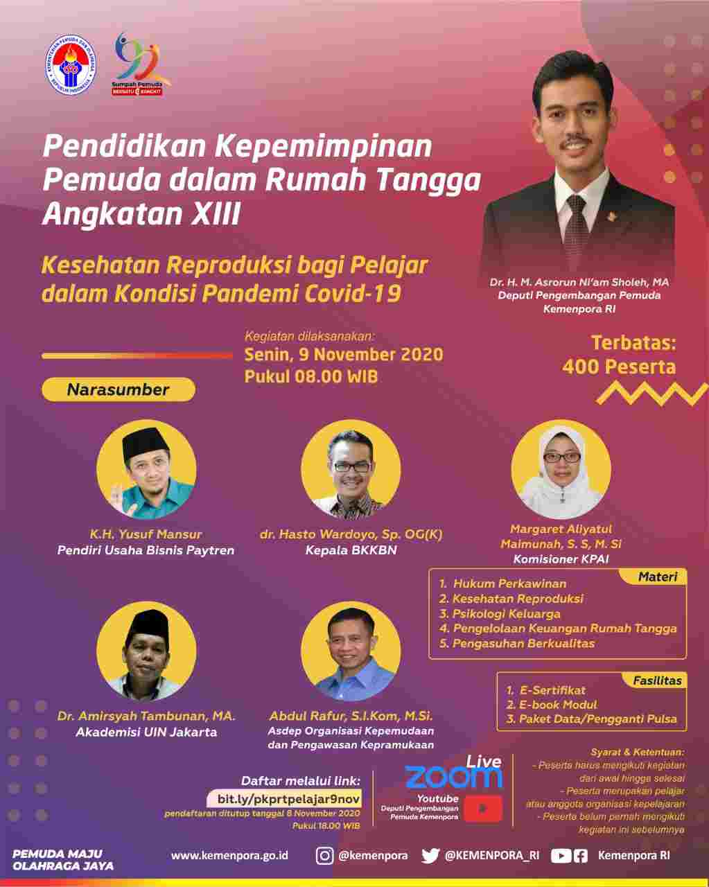 Hadir sebagai narasumber dalam kegiatan yang dilaksanakan secara daring tersebut antara lain; KH. Yusuf Mansur (Pendiri Usaha Bisnis Paytren), dr. Hasto Wardoyo, Sp. OG (K) (Kepala BKBBN), Margaret Aliyatul Maimunah, S.S, M.Si (Komisioner KPAI), Dr. Amirsyah Tambun , MA (Akademisi UIN Jakarta), dan Drs. Abdul Rofur, S.Ikom., M.Si.