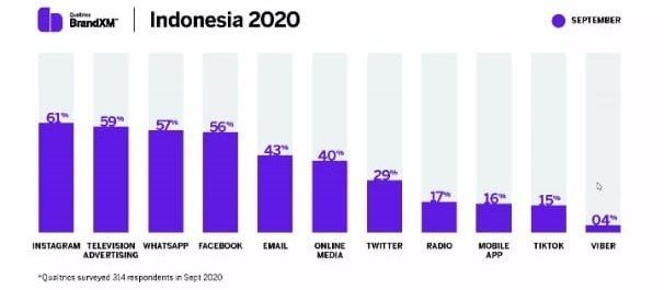 Dari sisi medium komunikasi merek yang paling efektif, Qualtrics mengungkapkan ada 5 channel komunikasi yang paling sering diakses konsumen, antara lain Instagram (61%), Whatsapp (57%), Facebook (56%), iklan TV (59%) dan e-mail (43%).