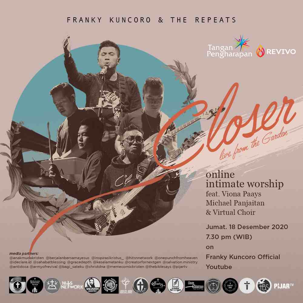 Setiap kita pasti memiliki kerinduan untuk memuji dan menyembah Tuhan bersama-sama dengan keluarga dan sahabat seperti dulu. Berangkat dari kerinduan tersebut, Franky Kuncoro dan The Repeats akan mengadakan malam pujian & penyembahan yang bertajuk ‘Closer Online Intimate Worship’ pada hari Jumat, tanggal 18 Desember 2020, pukul 19:30 WIB di Channel YouTube Franky Kuncoro Official.