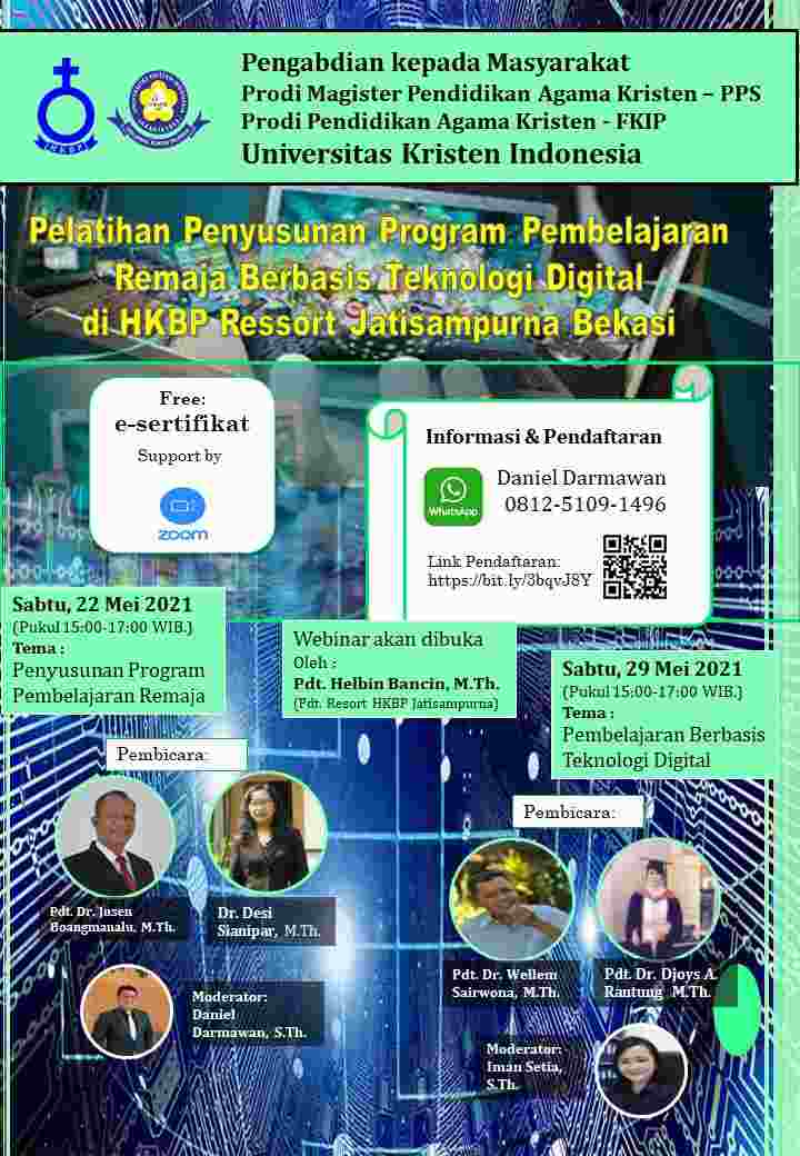 Pengabdian kepada Masyarakat (PkM) ini dilakukan melalui kerjasama Program Studi Magister Pendidikan Agama Kristen UKI (MPAK PPs UKI) dan Gereja HKBP Resort Jatisampurna Bekasi. Untuk hal ini, Program Studi Magister Pendidikan Agama Kristen menugaskan tiga dosen dan dua mahasiswa Prodi MPAK, serta Prodi Pendidikan Agama Kristen FKIP UKI menugaskan satu dosen untuk melakukan kegiatan pelatihan penyusunan program pembelajaran remaja berbasis teknologi digital di Gereja HKBP Resort Jatisampurna Bekasi.