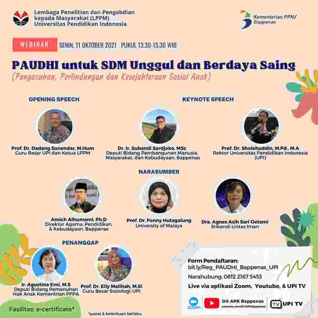 Direktorat Agama, Pendidikan, dan Kebudayaan Kementerian PPN/Bappenas bersama dengan LPPM Universitas Pendidikan Indonesia menyelenggarakan Webinar dengan Tema *”Pengembangan Anak Usia Dini Holistik Integratif untuk SDM Unggul dan Berdaya Saing (Pengasuhan, Pelindungan dan Kesejahteraan Sosial Anak)”* yang diselenggarakan pada Hari Senin, 11 Oktober 2021