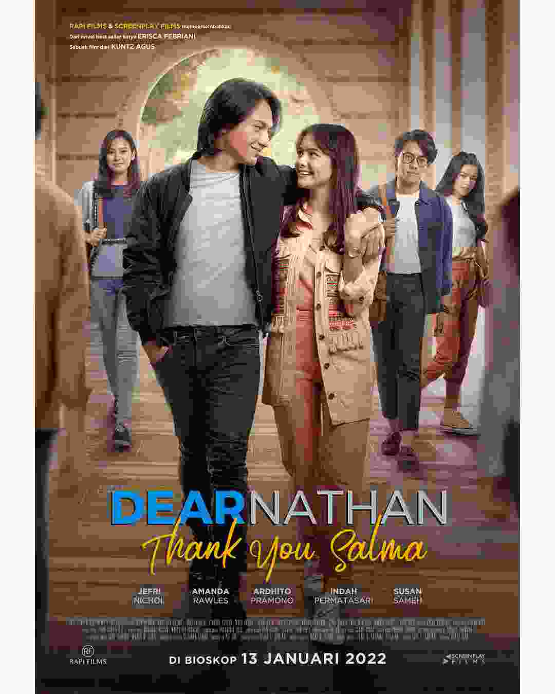 Film Dear Nathan Thank You Salma persembahan Rapi Films danScreenplay Films akhirnya tayang mulai 13 Januari 2021. Film penutup trilogi Dear Nathan inimasih hadir dengan dua pemeran utama yang sama, yaitu karakter Nathan yang diperankanoleh Jefri Nichol dan karakter Salma yang diperankan oleh Amanda Rawles.
