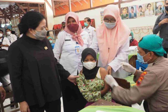 “Hebat ya, berani. Yang pertama kemarin juga nggak sakit kan? Sudah sarapan belum?” tanya Puan saat berkeliling ruang skrining dan vaksinasi sambil memberi semangat pada anak-anak yang menerima dosis vaksin.