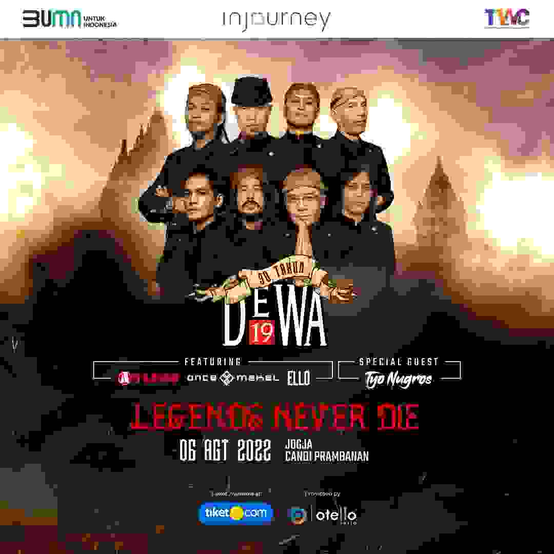 Otello Asia bersama BUMN, InJourney dan TWC dengan bangga akan menghadirkan Konser 30 Tahun Dewa 19 di Yogyakarta, saat ini DEWA 19 sedang menjalankan tur 30 Tahun-nya namun Kota Jogja akan menjadi berbeda dan Istimewa, karena Otello Asia akan mengemas konser ini di Candi Prambanan – Yogyakarta pada Sabtu, 06 Agustus 2022 secara berbeda dan spektakuler, “30 Tahun DEWA 19” akan menampilkan untuk pertama kali dalam satu panggung 3 vokalis utama Ari Lasso, Once Mekel, Ello dengan Special Guest Star Tyo Nugros – Full Team #30TahunDewa19FullTeam people say “Legends Never Die” Konser 30 Tahun DEWA 19 ini didukung oleh musisi Living Legends yang turut membesarkan perjalanan DEWA 19 di Blantika Musik Indonesia. acara konser ini dipromotori oleh Otello Asia dan didukung oleh BUMN, InJOurney dan TWC (Indonesia Heritage Management) dan online ticketing partner tiket.com