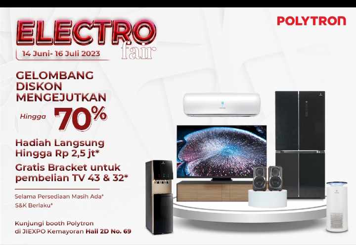 Jangan lewatkan promo dan diskon lainnya, misal dispenser Hydra, air conditioner, air purifier, dan lain sebagainya. Pada setiap pekannya, POLYTRON juga gelar flash sale untuk memeriahkan acara.